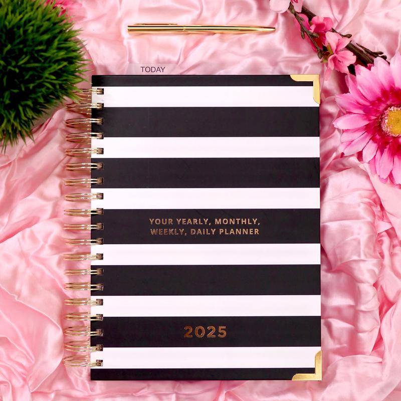 Our 2025 planner helps you stay organized down to the last hour of your day, with detailed hourly scheduling to keep you on track from sunrise to sunset. We invite you to explore this planner and embark on a journey toward a more organized, productive, and fulfilling year. Inside, you'll find thoughtfully designed sections for planning, reminders, and goal-setting. Our goal is to equip you with the tools and inspiration needed to bring your dreams to life!