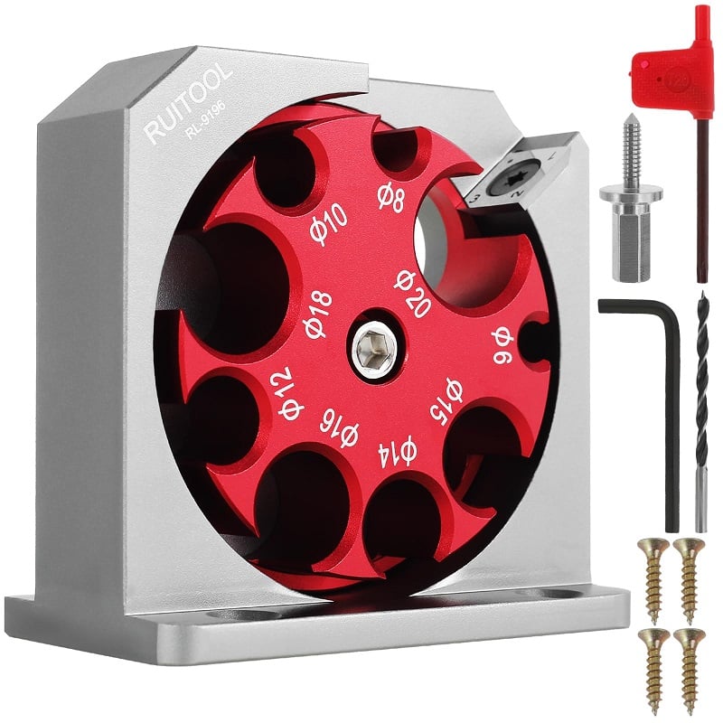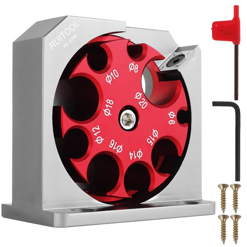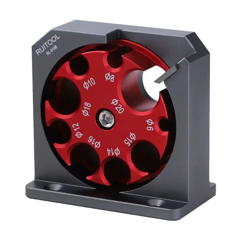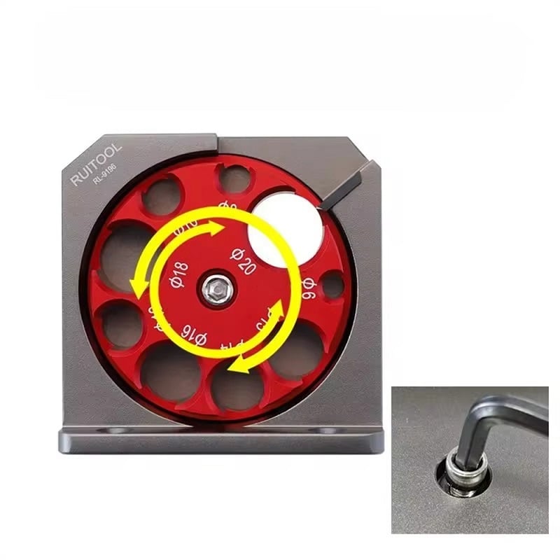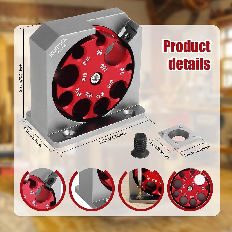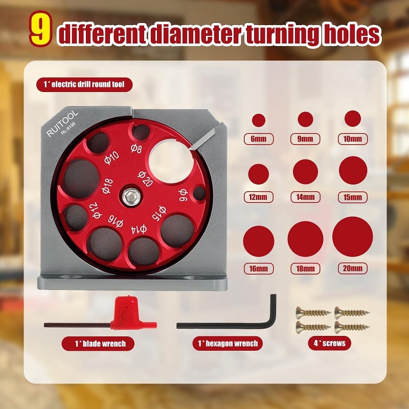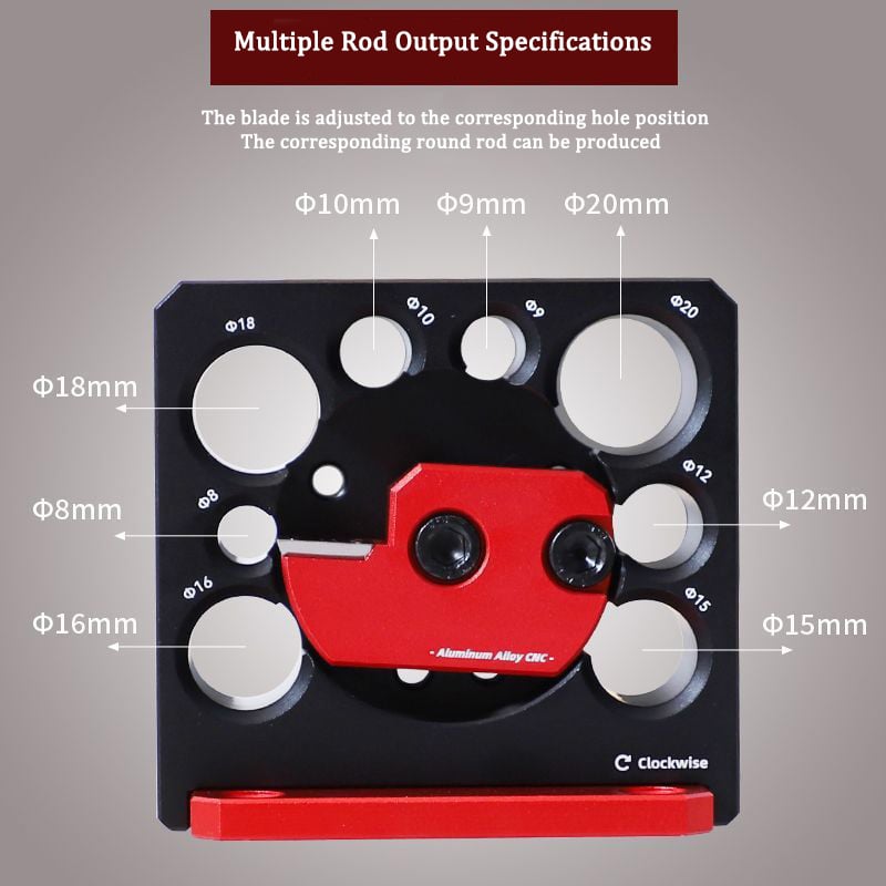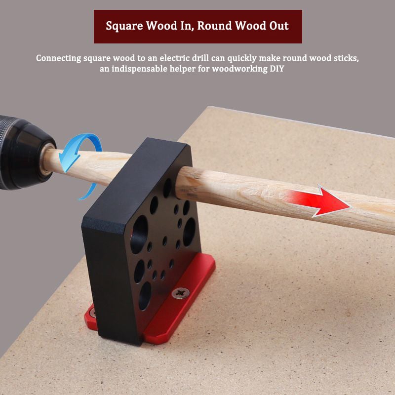 - Multiple Hole Sizes: The Electric Drill Milling Dowel Round Bar Auxiliary Tool features multiple rotating holes with diameters ranging from 6mm to 20mm. Easily adjust the desired diameter by loosening the screw and turning the red bracket, then secure with the tightening screw.